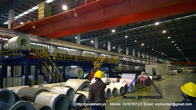 Đầu ra sản phẩm panel PU 150mm qua bàn ép băng tải thép, hóa chất sử dụng polyol hệ Cyclopentane